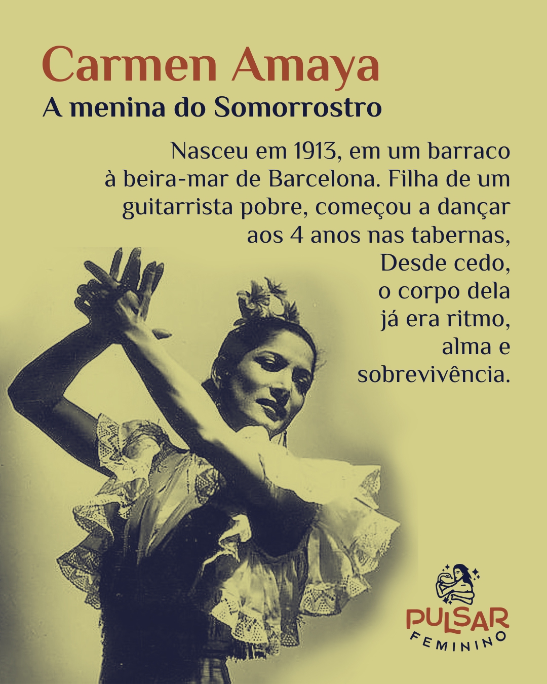 Carmen Amaya nasceu do ventre da terra e do som das cordas do violão do pai. Vinda do bairro pobre de Somorrostro, em Barcelona, dançou primeiro por necessidade — e talvez por destino. Aos quatro anos, já acompanhava o pai, o guitarrista “El Chino”, pelas tabernas, onde o compasso de seus pés pequenos misturava-se à fumaça, à fome e à esperança. Era uma menina cigana, incendiada por um ritmo que nenhum mestre ensinou.