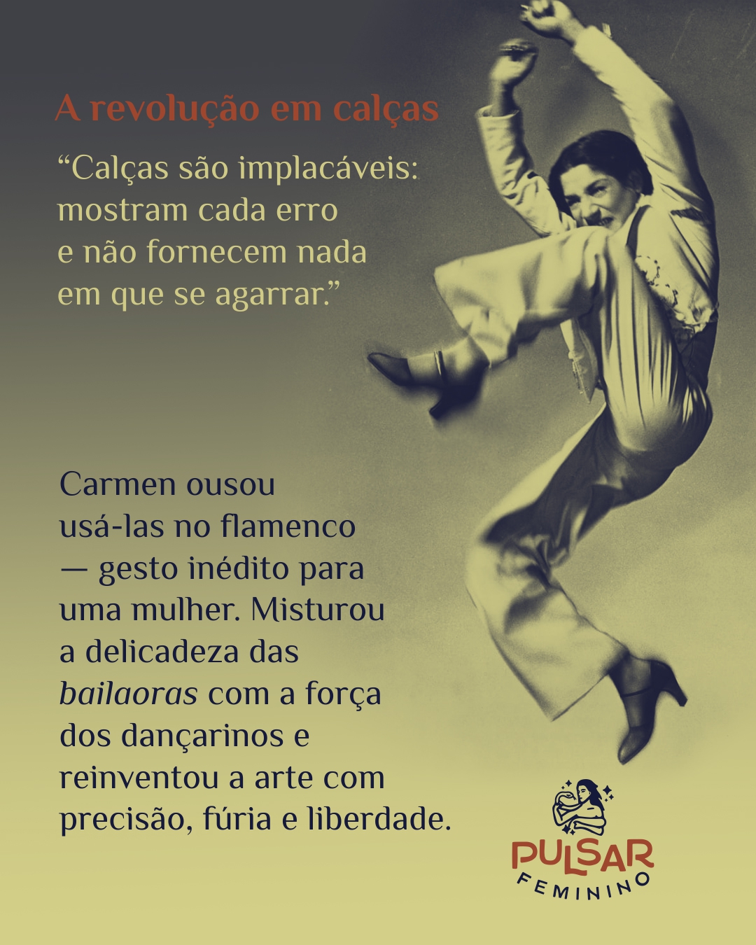 Quando subia aos palcos, algo inexplicável acontecia: o corpo de Carmen deixava de ser corpo e se tornava fogo. O crítico Sebastián Gasch escreveu que ela dançava como se a alma atravessasse o espaço — pura geometria em estado de graça. E foi assim, ardendo em precisão e fúria, que ela revolucionou o flamenco: uniu a suavidade das bailaoras ao vigor dos homens, ousando vestir calças — essas mesmas que, segundo ela, “são implacáveis: mostram cada erro e não fornecem nada em que se agarrar”.