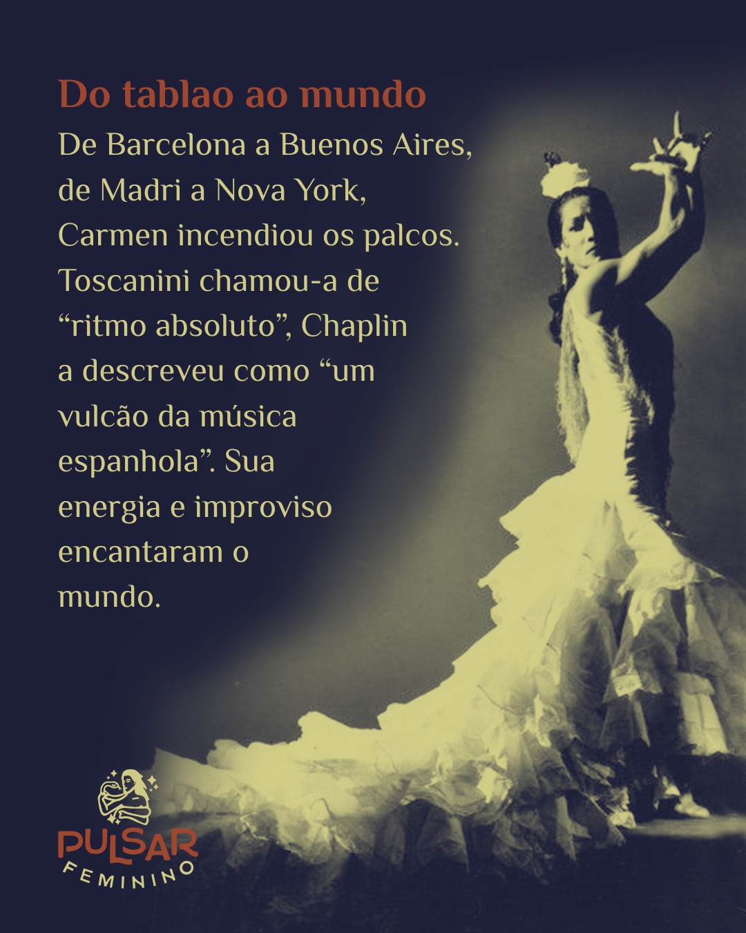 De Barcelona a Buenos Aires, dos tablaos de Madri ao Carnegie Hall, Carmen Amaya foi ovacionada como uma força da natureza. Toscanini viu nela o ritmo absoluto; Chaplin, um vulcão; Greta Garbo, a artista inimitável. No entanto, por trás da fama e do esplendor, havia sempre a menina que dançava para comprar pão. A pobreza da infância nunca lhe saiu dos olhos — talvez por isso fosse tão generosa, tão real, tão humana.