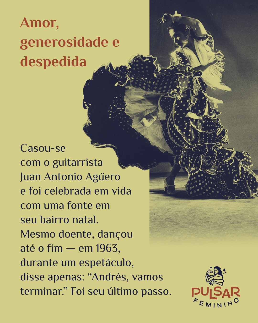 Ainda assim, Carmen dançou até o último gesto. Em Gandía, no verão de 1963, interrompeu uma apresentação e murmurou: “Andrés, vamos terminar”. Foi seu adeus.