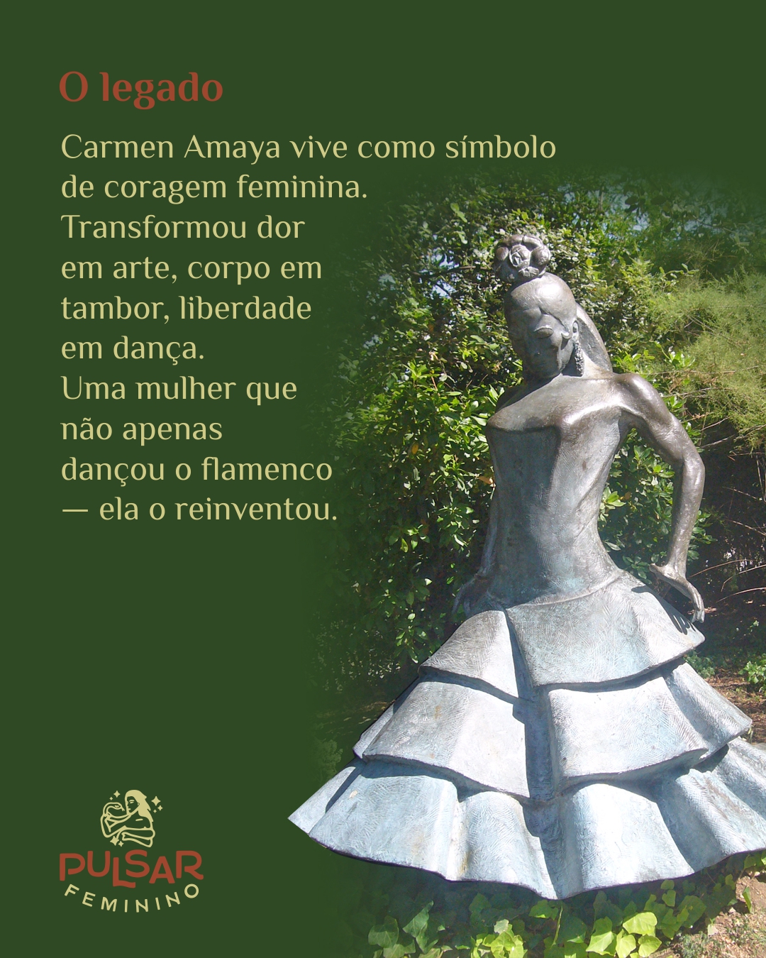 Carmen Amaya permanece símbolo de liberdade e coragem. Mulher que desafiou regras, que transformou dor em arte e corpo em tambor. Ela não apenas dançou o flamenco — ela o reinventou, com alma, fúria e amor, deixando às mulheres que vieram depois a herança do impossível tornado possível.